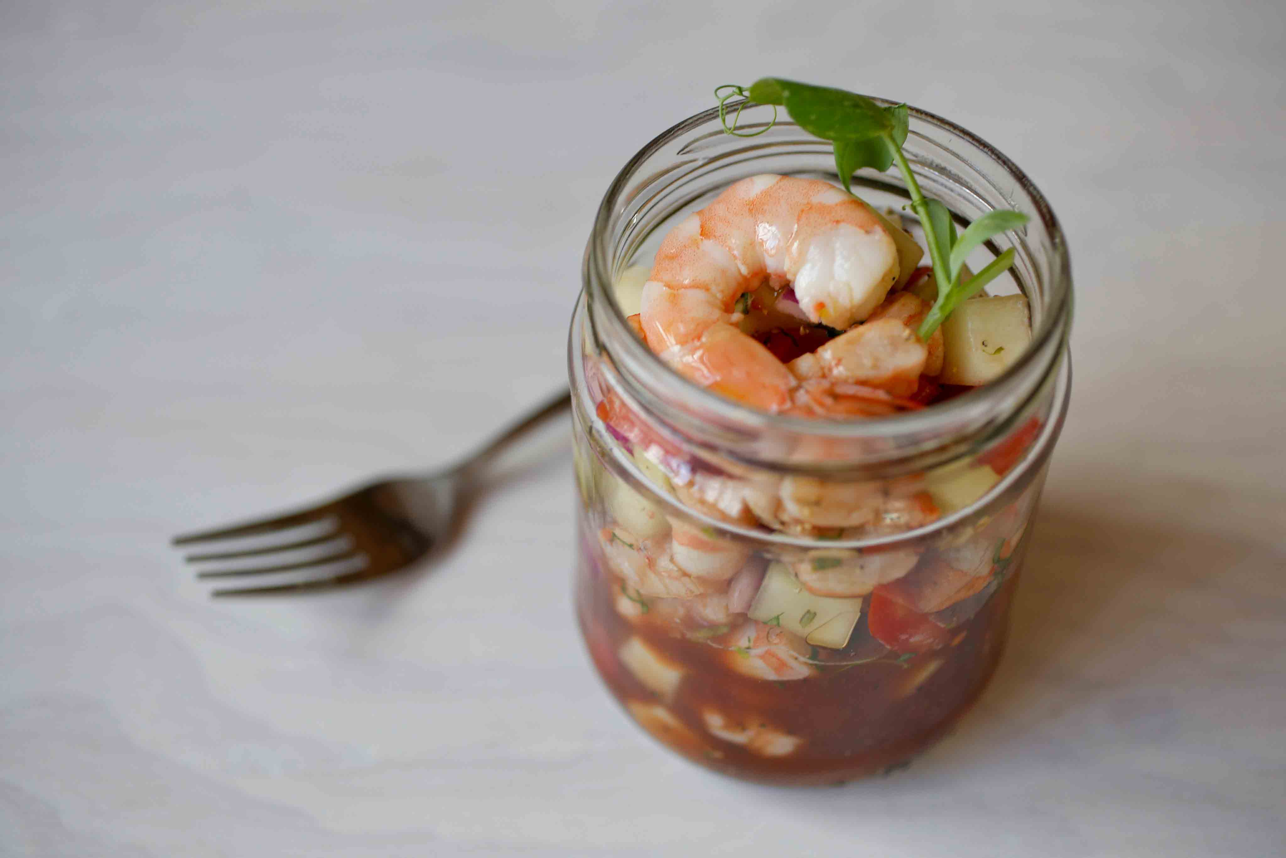 - Ceviche Arrollador: Se prepara con camarón cocido, tomate, pepino y cebolla morada, y esta salseado con clamato y limón.