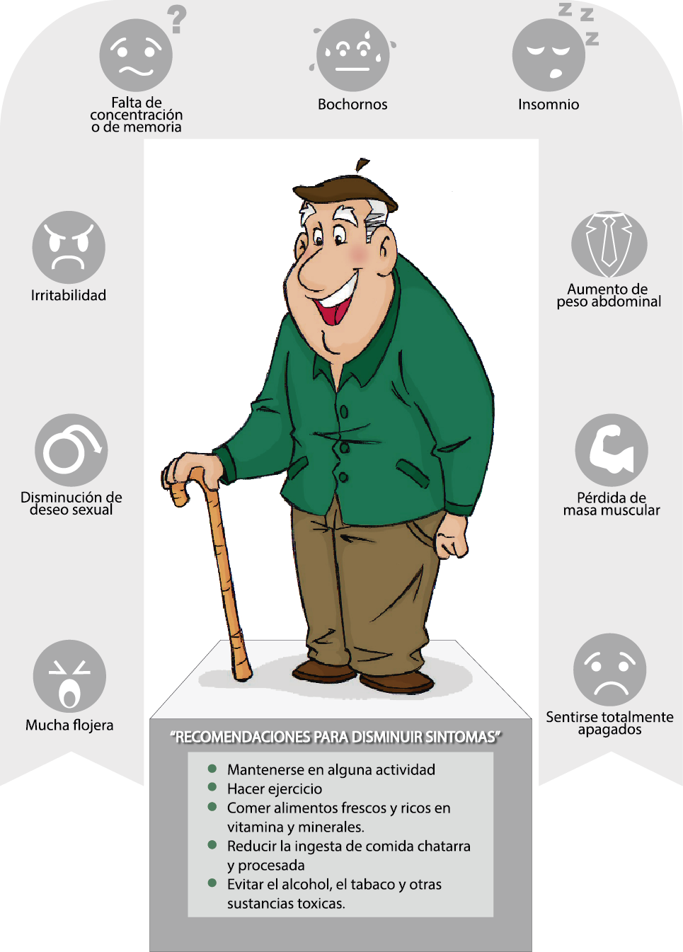 Los síntomas para aquellos que se deben prevenir es: Mucha flojera, disminución en deseo sexual (así que no solo pasa en mujeres), sabemos que los hombres son muy sexuales pero en esta etapa se pierde, irritabilidad, falta de concentración o de memoria, bochornos, insomnio, aumento de peso abdominal, pérdida de masa muscular y nos sentimos totalmente apagados. Sufrirán de la calidad y firmeza de las erecciones, pueden haber problemas porque se podrían presentar conflictos de pareja porque se pierden hormonas sexuales masculinas y pueden comenzar las desconfianzas entre la pareja. Es importante cuando comiencen a notar cambios en su organismo acudan al médico, soliciten una prueba de testosterona en cualquier laboratorio y su médico será el único en saber si se requieren más estudios como de: glucosa, colesterol o disotrometría ósea. Los huesos también pierden calcio. Por este motivo es importante acudir a tiempo para una valoración completa e integral. Si son acompañados por su pareja se va a lograr un mejor éxito en el tratamiento.
